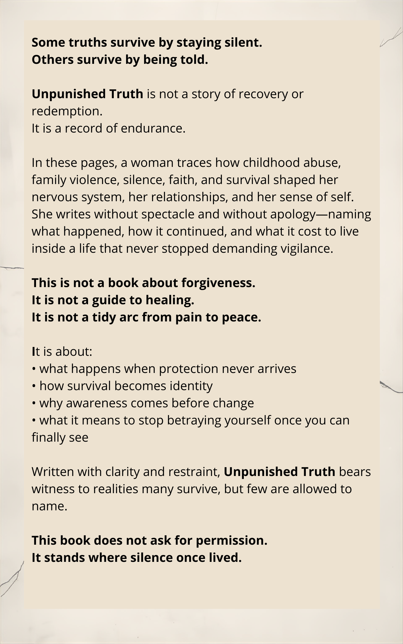 In these pages, a woman traces how childhood abuse, family violence, silence, faith, and survival shaped her nervous system, her relationships, and her sense of self. She writes without spectacle and without apology—naming what happened, how it continued, and what it cost to live inside a life that never stopped demanding vigilance.